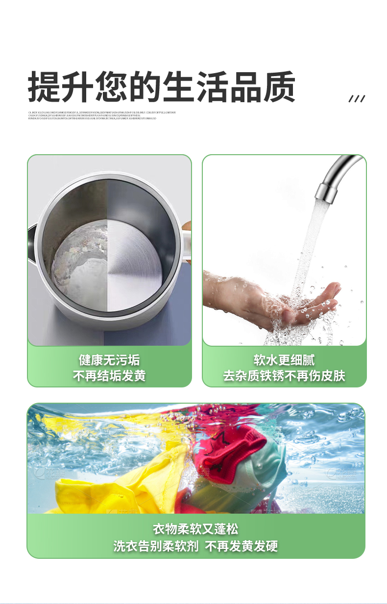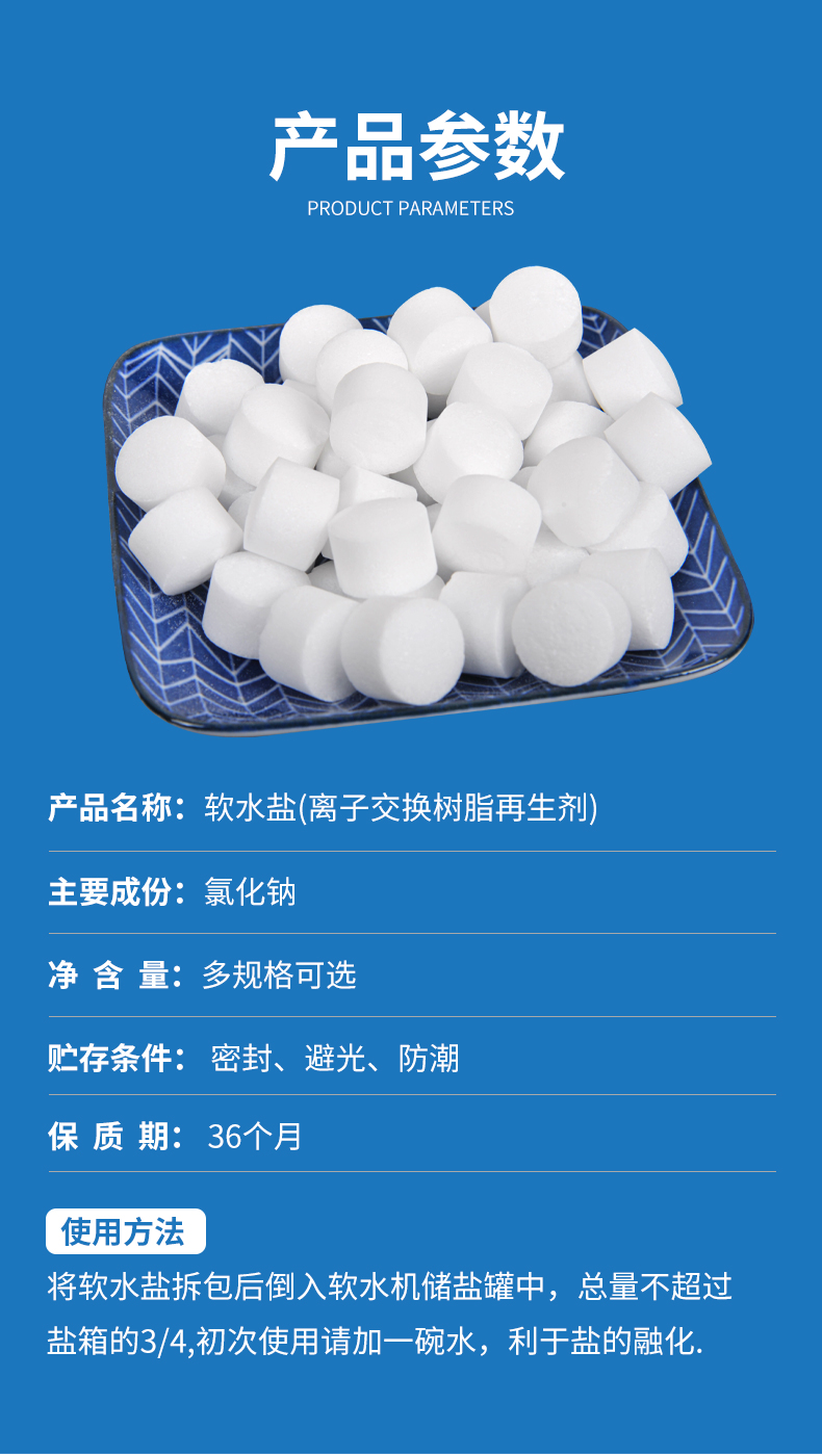 使用方法:將軟水鹽拆包后倒入軟水機儲鹽罐中,總量不超過(guò)鹽箱的3/4,初次使用請加一碗水,利于鹽的融化。